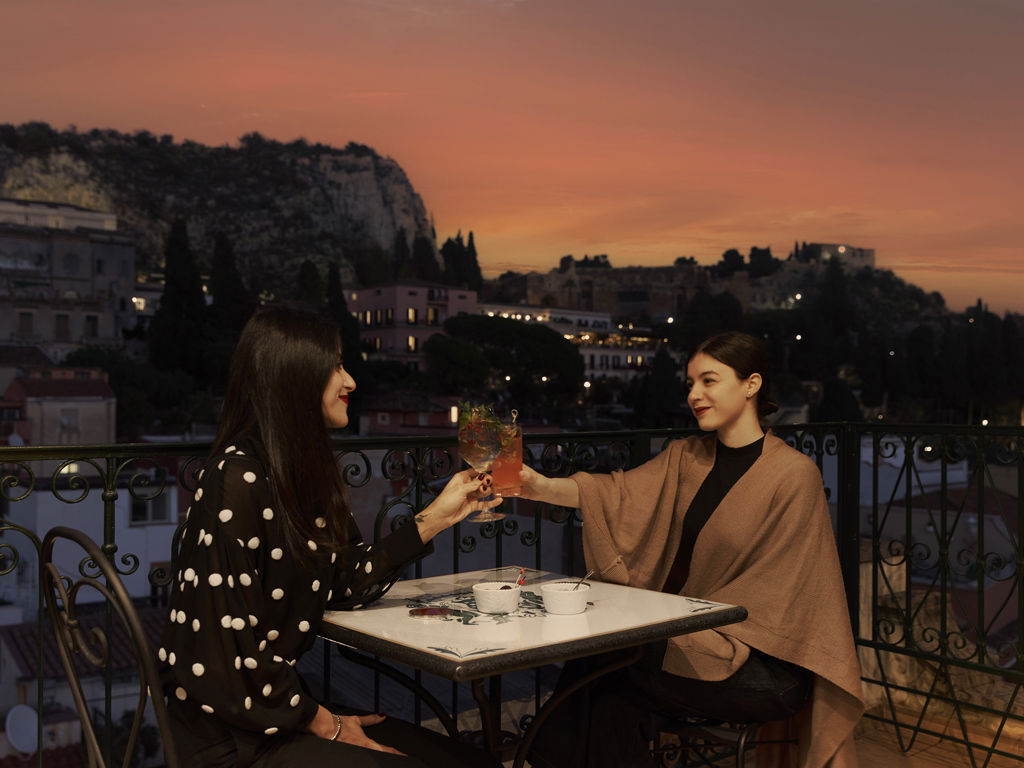 The Al Settimo Cielo rooftop offers one of the most captivating views in Taormina, stretching from the Greek Theatre to the Duca di Cesarò Park, from Naxos Bay to the fiery sunsets over Mount Etna, which majestically towers on the horizon.