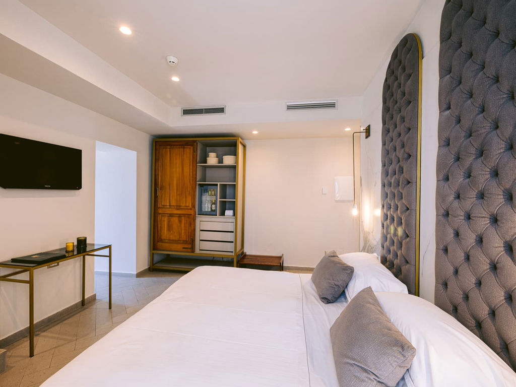 The high-quality linen helps to ensure a relaxing sleep. The room has a separate living area, with a comfortable chaise longue that can be used as a third bed. The private balcony offers a perfect corner to sip a drink at sunset or simply relax while observing the view.